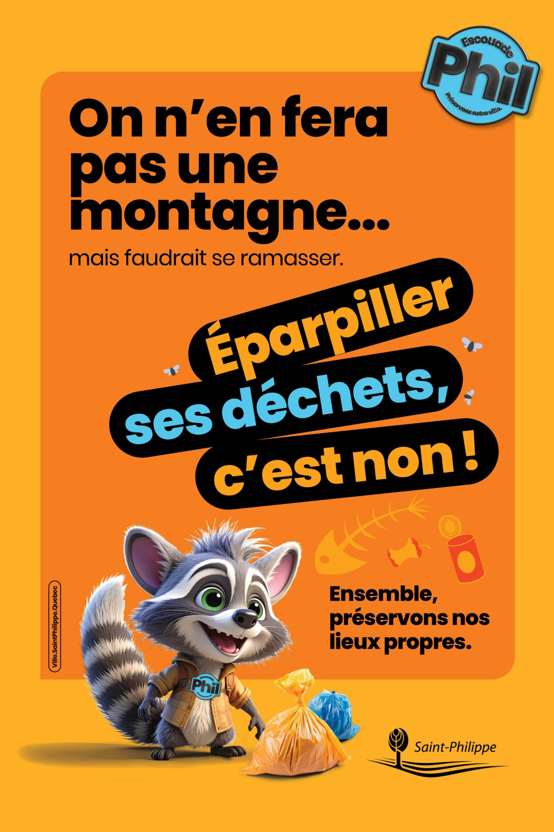 Le raton laveur porte le message de la propreté et la gestion des déchets. (Photo : gracieuseté – Ville de Saint-Philippe)