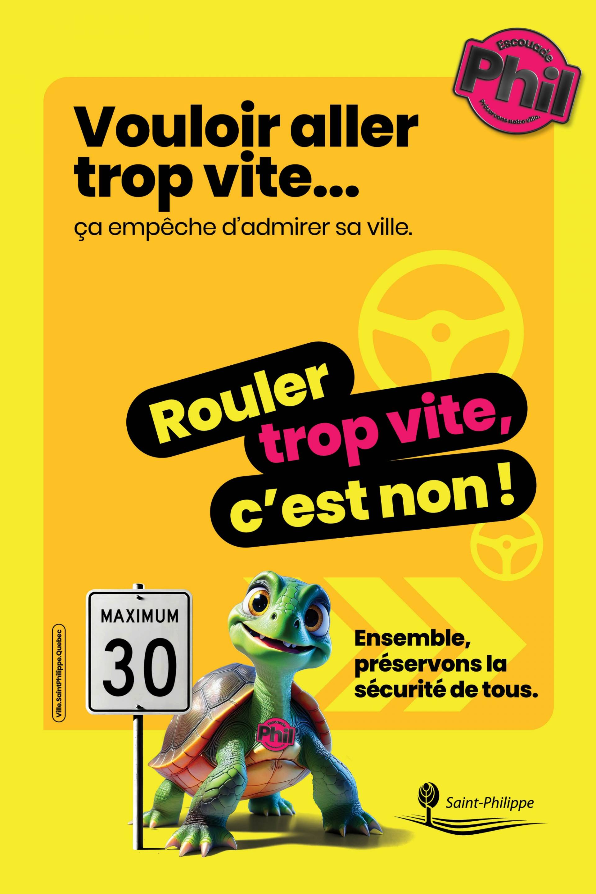 La tortue porte le message de la prudence et de la sécurité routière. (Photo : gracieuseté – Ville de Saint-Philippe)